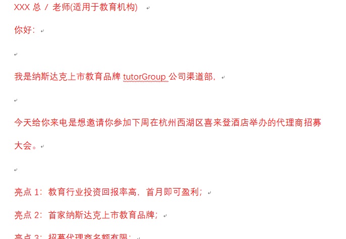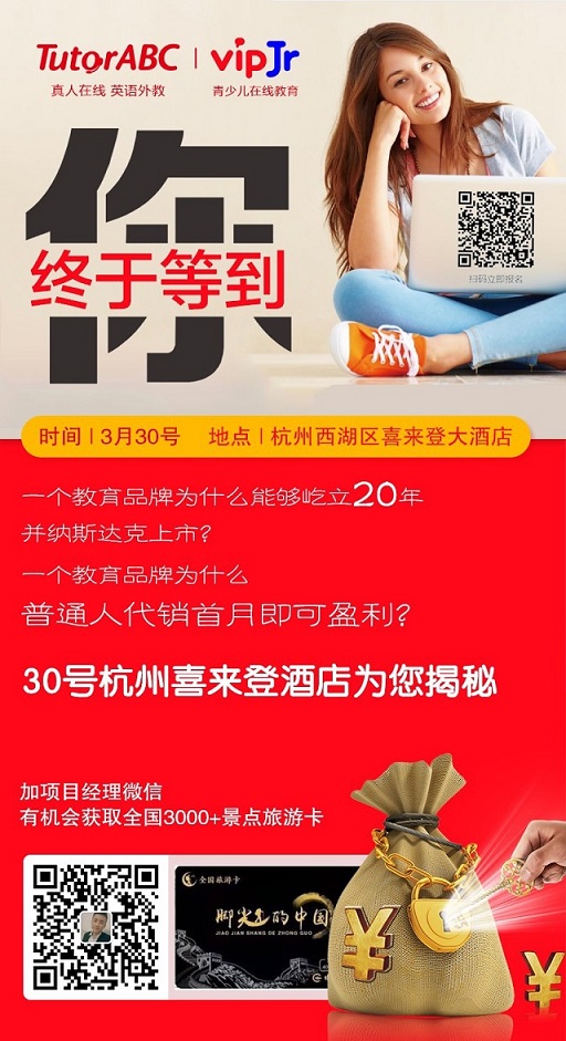 iTutorGroup在線教育集團(tuán)于2001年創(chuàng)立,是全球最大的教育集團(tuán),布局全世界80多個(gè)國(guó)家,擁有5000多位員工、超過(guò)20000名外籍顧問(wèn),每年提供3000萬(wàn)堂在線課程。ITutorGroup在全國(guó)各大城市召開(kāi)代銷(xiāo)會(huì),主推vipJr在線青少兒教育以及TutorABC成人在線英語(yǔ)。iTutorGroup在線教育集團(tuán)中國(guó)公司找到贏想力合作,為每次的代銷(xiāo)會(huì)議邀約高質(zhì)量的潛在投資者到場(chǎng)。