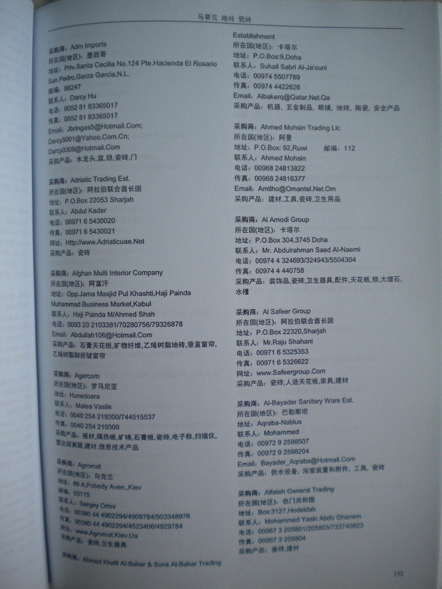 書刊簡(jiǎn)介:《全球采商黃頁》系列叢書是由全球最活躍的專業(yè)買家及重要國(guó)際性展會(huì)的到會(huì)采購(gòu)商名片信息匯編而成,包含三十多個(gè)行業(yè)分類,匯集了各類產(chǎn)品的買家信息。其中收錄的每家采購(gòu)商信息均是我們通過與買家面對(duì)面的登記整理收集而成,采購(gòu)意向明確,針對(duì)性強(qiáng)。為了確保信息的準(zhǔn)確性和時(shí)效性,我們定期進(jìn)行跟進(jìn)、回訪、補(bǔ)充及更新工作。每家采購(gòu)商信息包括國(guó)別、公司名稱、聯(lián)系人、地址、電話、傳真、電郵、網(wǎng)址、采購(gòu)產(chǎn)品等詳細(xì)內(nèi)容,每?jī)?cè)《黃頁》約有兩千家左右的采購(gòu)商信息。在當(dāng)前國(guó)際出口形勢(shì)日趨嚴(yán)峻的環(huán)境下,如何降低成本開拓國(guó)際市場(chǎng),是每個(gè)出口企業(yè)急需尋找的答案,我們相信通過我們10多年的外貿(mào)信息服務(wù)經(jīng)驗(yàn)和最新的國(guó)際買家資源服務(wù),將會(huì)為您拓展全球市場(chǎng)提供最直接有效的幫助。專業(yè)對(duì)口的買家信息一定會(huì)幫助貴公司打開更廣闊的外貿(mào)市場(chǎng)!