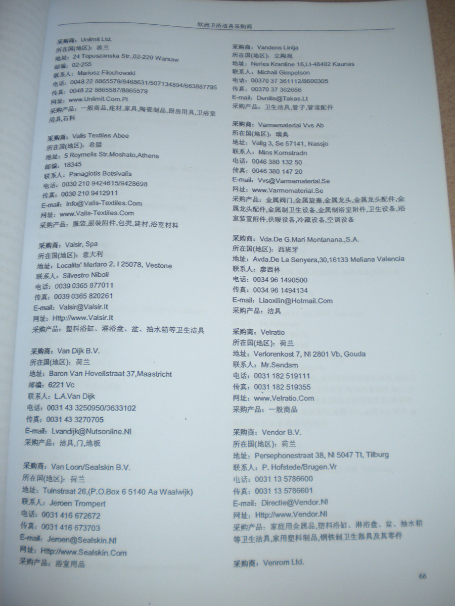 書刊簡介:《全球采商黃頁》系列叢書是由全球最活躍的專業(yè)買家及重要國際性展會的到會采購商名片信息匯編而成,包含三十多個行業(yè)分類,匯集了各類產(chǎn)品的買家信息。其中收錄的每家采購商信息均是我們通過與買家面對面的登記整理收集而成,采購意向明確,針對性強。為了確保信息的準確性和時效性,我們定期進行跟進、回訪、補充及更新工作。每家采購商信息包括國別、公司名稱、聯(lián)系人、地址、電話、傳真、電郵、網(wǎng)址、采購產(chǎn)品等詳細內(nèi)容,每冊《黃頁》約有兩千家左右的采購商信息。在當(dāng)前國際出口形勢日趨嚴峻的環(huán)境下,如何降低成本開拓國際市場,是每個出口企業(yè)急需尋找的答案,我們相信通過我們10多年的外貿(mào)信息服務(wù)經(jīng)驗和最新的國際買家資源服務(wù),將會為您拓展全球市場提供最直接有效的幫助。專業(yè)對口的買家信息一定會幫助貴公司打開更廣闊的外貿(mào)市場!
