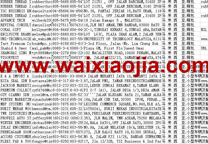 馬來西亞采購商名單數(shù)據(jù)為Excel格式,信息可任意修改、復(fù)制、打印、導(dǎo)出及導(dǎo)入到傳真、郵件群發(fā)等軟件中,無任何限制。