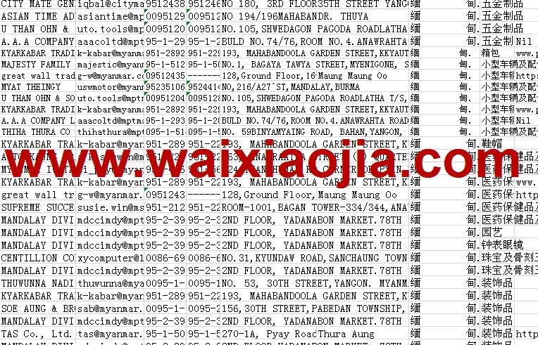 緬甸采購(gòu)商名單數(shù)據(jù)為Excel格式,信息可任意修改、復(fù)制、打印、導(dǎo)出及導(dǎo)入到傳真、郵件群發(fā)等軟件中,無(wú)任何限制。
