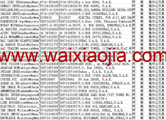 阿聯(lián)酋采購商名單數(shù)據(jù)為Excel格式,信息可任意修改、復(fù)制、打印、導(dǎo)出及導(dǎo)入到傳真、郵件群發(fā)等軟件中,無任何限制。