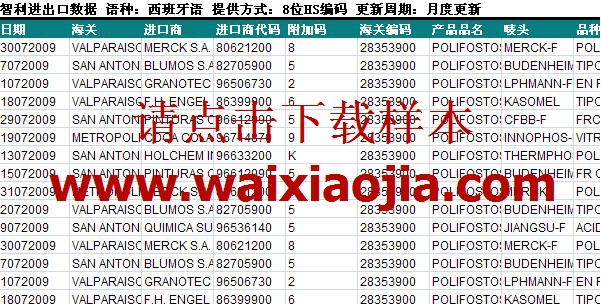 智利進(jìn)口關(guān)單數(shù)據(jù),以智利本土企業(yè)向全球 200 多個(gè)國家和地區(qū)進(jìn)口各類商品的進(jìn)口申報(bào)單證為依據(jù)。按照具體產(chǎn)品的精確 HS 編碼提供。內(nèi)容包括:進(jìn)口日期、進(jìn)口海關(guān)、進(jìn)口商名稱、 進(jìn)口商代碼、附加碼、海關(guān)編碼、產(chǎn)品品名、嘜頭、品種、原產(chǎn)國、中轉(zhuǎn)國、付款方式、交易條款、運(yùn)輸方式、海運(yùn)公司、起運(yùn)港、目的港、貨物類型、重量、重量單位等