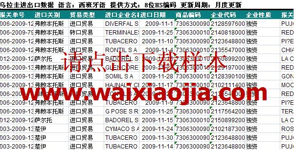 烏拉圭進(jìn)口關(guān)單數(shù)據(jù),以 巴拉圭 本土企業(yè)向全球 200 多個(gè)國(guó)家和地區(qū)進(jìn)口各類商品的進(jìn)口申報(bào)單證為依據(jù)。按照具體產(chǎn)品的精確 HS 編碼提供。數(shù)據(jù)內(nèi)容包括:貿(mào)易類型、 關(guān)單號(hào)、通關(guān)日期、進(jìn)口商代碼、進(jìn)口商名稱、進(jìn)口商地址、電話、原產(chǎn)國(guó)、貿(mào)易國(guó)、通關(guān)口岸、 FOB 總價(jià)、 CIF 總價(jià)、數(shù)量、數(shù)量單位、 CIF 單價(jià)、千克凈重、千克毛重、保險(xiǎn)費(fèi)、運(yùn)輸費(fèi)、運(yùn)輸方式、運(yùn)輸公司、出口商、海關(guān)編碼、產(chǎn)品描述
