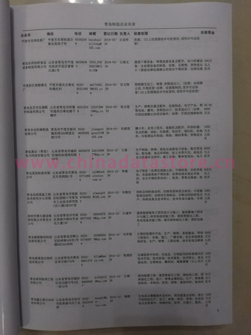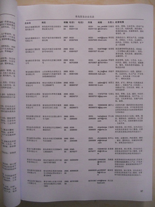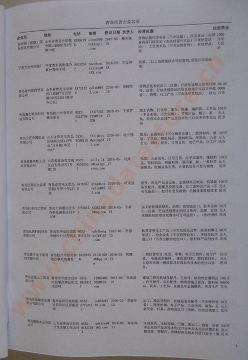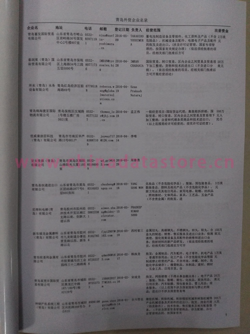2021版最新青島企業(yè)黃頁(yè)包括《青島制造企業(yè)黃頁(yè)》、《青島貿(mào)易企業(yè)黃頁(yè)》、《青島民營(yíng)企業(yè)黃頁(yè)》、《青島外資企業(yè)黃頁(yè)》、《青島外貿(mào)企業(yè)黃頁(yè)》共五冊(cè),現(xiàn)優(yōu)惠價(jià):280元/冊(cè)。每?jī)?cè)內(nèi)容包括:?jiǎn)挝幻Q、地址、郵編、電話、傳真、郵箱、經(jīng)營(yíng)范圍等;青島企業(yè)黃頁(yè)涵蓋了近幾年來(lái)最新成立的、有一定規(guī)模的企業(yè),具有非常高的營(yíng)銷價(jià)值。有了這套黃頁(yè)開展業(yè)務(wù)也有了針對(duì)性,也省去了盲目去尋找客戶名單而浪費(fèi)的時(shí)間了,工作效率也會(huì)有很大的提高。歡迎需要青島企業(yè)黃頁(yè)的朋友及時(shí)聯(lián)系我們!