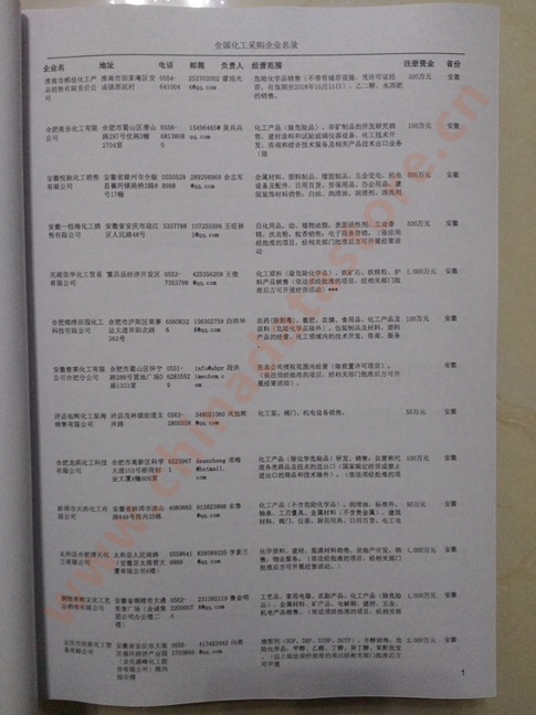 2024年新版中國化工采購企業(yè)黃頁,收錄了全國各地經(jīng)營范圍涉及化工產(chǎn)品的貿(mào)易企業(yè),這些都是頗具實(shí)力的化工產(chǎn)品的中國采購商。黃頁內(nèi)容包含:企業(yè)名稱、地址、電話、傳真、郵箱、經(jīng)營范圍、省份、注冊資金等信息。該套黃頁包含一個(gè)黃頁光碟加一冊紙質(zhì)書刊,全國價(jià)格:1500元,省/直轄市價(jià)格:400元,城市價(jià)格:200元,共收錄了全國各地大概77995(統(tǒng)計(jì)日期:2018.1)家化工產(chǎn)品采購企業(yè)。黃頁光碟中是EXCEL格式,信息可任意修改、復(fù)制、打印、導(dǎo)出及導(dǎo)入到傳真、郵件群發(fā)等軟件中,無任何限制。
