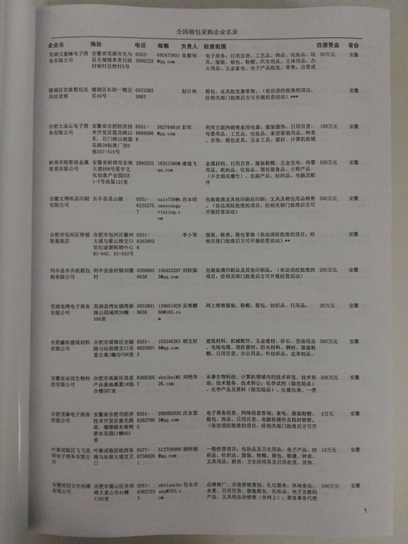 2024年新版中國箱包采購企業(yè)黃頁,收錄了全國各地經(jīng)營范圍涉及箱包產(chǎn)品的貿(mào)易企業(yè),這些都是頗具實(shí)力的箱包產(chǎn)品的中國采購商。黃頁內(nèi)容包含:企業(yè)名稱、地址、電話、傳真、郵箱、經(jīng)營范圍、省份、注冊資金等信息。該套黃頁包含一個(gè)黃頁光碟加一冊紙質(zhì)書刊,全國價(jià)格:1500元,省/直轄市價(jià)格:400元,城市價(jià)格:200元,共收錄了全國各地大概2542(統(tǒng)計(jì)日期:2018.1)家箱包產(chǎn)品采購企業(yè)。黃頁光碟中是EXCEL格式,信息可任意修改、復(fù)制、打印、導(dǎo)出及導(dǎo)入到傳真、郵件群發(fā)等軟件中,無任何限制。