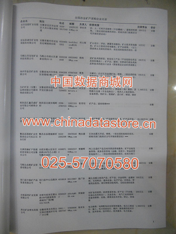2024年新版中國(guó)冶金礦產(chǎn)采購企業(yè)黃頁,收錄了全國(guó)各地經(jīng)營(yíng)范圍涉及冶金礦產(chǎn)產(chǎn)品的貿(mào)易企業(yè),這些都是頗具實(shí)力的冶金礦產(chǎn)產(chǎn)品的中國(guó)采購商。黃頁內(nèi)容包含:企業(yè)名稱、地址、電話、傳真、郵箱、經(jīng)營(yíng)范圍、省份、注冊(cè)資金等信息。該套黃頁包含一個(gè)黃頁光碟加一冊(cè)紙質(zhì)書刊,全國(guó)價(jià)格:1500元,省/直轄市價(jià)格:400元,城市價(jià)格:200元,共收錄了全國(guó)各地大概8042(統(tǒng)計(jì)日期:2018.1)家冶金礦產(chǎn)產(chǎn)品采購企業(yè)。黃頁光碟中是EXCEL格式,信息可任意修改、復(fù)制、打印、導(dǎo)出及導(dǎo)入到傳真、郵件群發(fā)等軟件中,無任何限制。