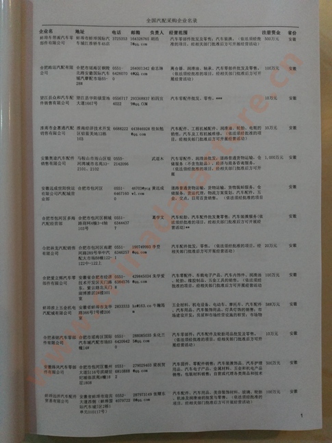 2024年新版中國汽配采購企業(yè)黃頁,收錄了全國各地經(jīng)營范圍涉及汽配產(chǎn)品的貿(mào)易企業(yè),這些都是頗具實力的汽配產(chǎn)品的中國采購商。黃頁內(nèi)容包含:企業(yè)名稱、地址、電話、傳真、郵箱、經(jīng)營范圍、省份、注冊資金等信息。該套黃頁包含一個黃頁光碟加一冊紙質(zhì)書刊,全國價格:1500元,省/直轄市價格:400元,城市價格:200元,共收錄了全國各地大概8952(統(tǒng)計日期:2018.1)家汽配產(chǎn)品采購企業(yè)。黃頁光碟中是EXCEL格式,信息可任意修改、復(fù)制、打印、導(dǎo)出及導(dǎo)入到傳真、郵件群發(fā)等軟件中,無任何限制。