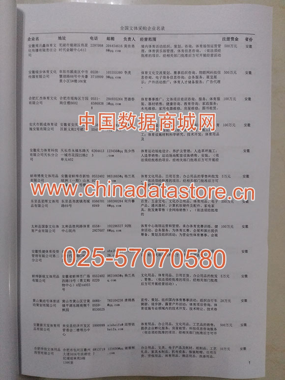 2024年新版中國文體戶外采購企業(yè)黃頁,收錄了全國各地經(jīng)營范圍涉及文體戶外產(chǎn)品的貿(mào)易企業(yè),這些都是頗具實(shí)力的文體戶外產(chǎn)品的中國采購商。黃頁內(nèi)容包含:企業(yè)名稱、地址、電話、傳真、郵箱、經(jīng)營范圍、省份、注冊資金等信息。該套黃頁包含一個黃頁光碟加一冊紙質(zhì)書刊,全國價格:1500元,省/直轄市價格:400元,城市價格:200元,共收錄了全國各地大概849(統(tǒng)計(jì)日期:2018.1)家文體戶外產(chǎn)品采購企業(yè)。黃頁光碟中是EXCEL格式,信息可任意修改、復(fù)制、打印、導(dǎo)出及導(dǎo)入到傳真、郵件群發(fā)等軟件中,無任何限制。