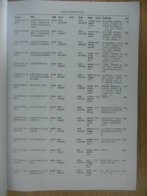 2024年新版中國玩具采購企業(yè)黃頁,收錄了全國各地經(jīng)營范圍涉及玩具產(chǎn)品的貿(mào)易企業(yè),這些都是頗具實力的玩具產(chǎn)品的中國采購商。黃頁內(nèi)容包含:企業(yè)名稱、地址、電話、傳真、郵箱、經(jīng)營范圍、省份、注冊資金等信息。該套黃頁包含一個黃頁光碟加一冊紙質(zhì)書刊,全國價格:1500元,省/直轄市價格:400元,城市價格:200元,共收錄了全國各地大概1852(統(tǒng)計日期:2018.1)家玩具產(chǎn)品采購企業(yè)。黃頁光碟中是EXCEL格式,信息可任意修改、復(fù)制、打印、導(dǎo)出及導(dǎo)入到傳真、郵件群發(fā)等軟件中,無任何限制。