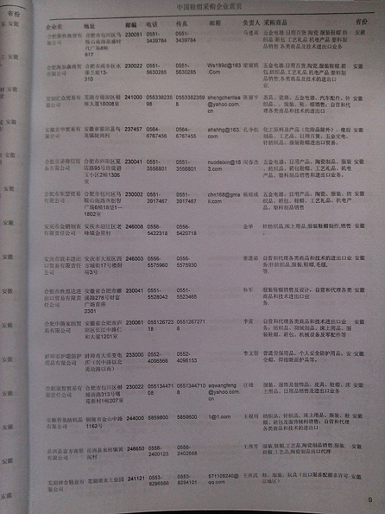 2024年新版中國鞋帽采購企業(yè)黃頁,收錄了全國各地經(jīng)營范圍涉及鞋帽產(chǎn)品的貿(mào)易企業(yè),這些都是頗具實(shí)力的鞋帽產(chǎn)品的中國采購商。黃頁內(nèi)容包含:企業(yè)名稱、地址、電話、傳真、郵箱、經(jīng)營范圍、省份、注冊(cè)資金等信息。該套黃頁包含一個(gè)黃頁光碟加一冊(cè)紙質(zhì)書刊,全國價(jià)格:1500元,省/直轄市價(jià)格:400元,城市價(jià)格:200元,共收錄了全國各地大概6060(統(tǒng)計(jì)日期:2018.1)家鞋帽產(chǎn)品采購企業(yè)。黃頁光碟中是EXCE黃頁光碟中是EXCEL格式,信息可任意修改、復(fù)制、打印、導(dǎo)出及導(dǎo)入到傳真、郵件群發(fā)等軟件中,無任何限制。