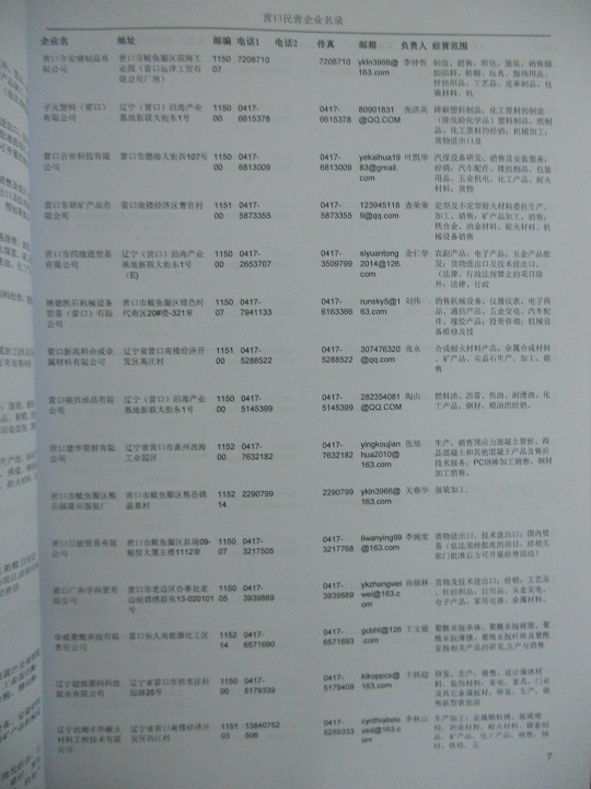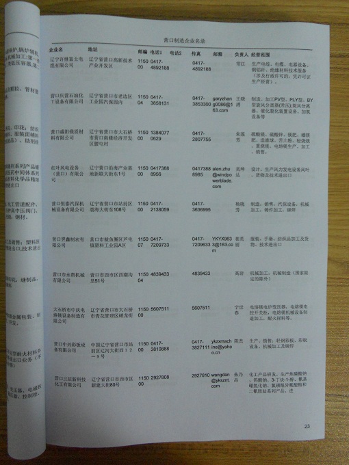 2021版最新營口企業(yè)黃頁包括《營口制造企業(yè)黃頁》、《營口民營企業(yè)黃頁》,現(xiàn)優(yōu)惠價:280元/冊。每冊內(nèi)容包括:單位名稱、地址、郵編、電話、傳真、郵箱、經(jīng)營范圍等;營口企業(yè)黃頁涵蓋了近幾年來最新成立的、有一定規(guī)模的企業(yè),具有非常高的營銷價值。有了這套黃頁開展業(yè)務(wù)也有了針對性,也省去了盲目去尋找客戶名單而浪費的時間了,工作效率也會有很大的提高。歡迎需要營口企業(yè)黃頁的朋友及時聯(lián)系我們!