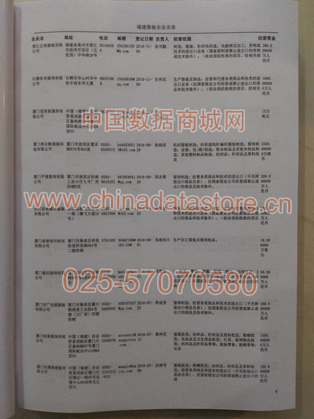 最新福建服裝生產(chǎn)與貿(mào)易企業(yè)黃頁數(shù)據(jù)更新日期2024年12月最新,福建服裝企業(yè)黃頁,都是具有一定規(guī)模的福建服裝行業(yè)的注冊實體企業(yè),數(shù)據(jù)準(zhǔn)確率高,是您開展各項營銷活動的必備資料。企業(yè)名單包括:企業(yè)名稱、地址、電話(以上必有,以下選有)、傳真、郵箱、登記日期、經(jīng)營范圍、注冊資金等信息。福建服裝企業(yè)黃頁數(shù)據(jù)為Excel格式,信息可任意修改、復(fù)制、打印、導(dǎo)出及導(dǎo)入到傳真、郵件群發(fā)等軟件中,無任何限制。