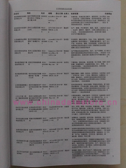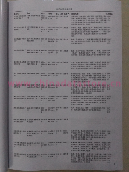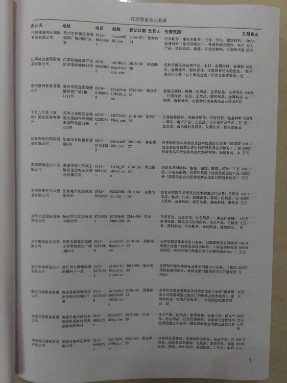2021版最新江蘇企業(yè)黃頁包括《江蘇制造企業(yè)黃頁》、《江蘇貿(mào)易企業(yè)黃頁》、《江蘇民營(yíng)企業(yè)黃頁》共三冊(cè),優(yōu)惠價(jià):280元/冊(cè)。每?jī)?cè)內(nèi)容包括:?jiǎn)挝幻Q、地址、郵編、電話、傳真、郵箱、經(jīng)營(yíng)范圍等;江蘇企業(yè)黃頁涵蓋了近幾年來最新成立的、有一定規(guī)模的企業(yè),具有非常高的營(yíng)銷價(jià)值。有了這套黃頁開展業(yè)務(wù)也有了針對(duì)性,也省去了盲目去尋找客戶名單而浪費(fèi)的時(shí)間了,工作效率也會(huì)有很大的提高。歡迎需要江蘇企業(yè)黃頁的朋友及時(shí)聯(lián)系我們!