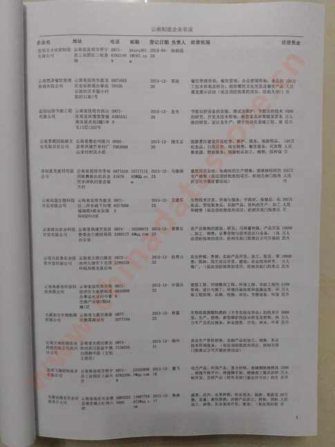 2021版最新云南企業(yè)黃頁包括《云南制造企業(yè)黃頁》、《云南貿(mào)易企業(yè)黃頁》、《云南民營企業(yè)黃頁》共三冊,優(yōu)惠價:280元/冊。每冊內(nèi)容包括:單位名稱、地址、郵編、電話、傳真、郵箱、經(jīng)營范圍等;云南企業(yè)黃頁涵蓋了近幾年來最新成立的、有一定規(guī)模的企業(yè),具有非常高的營銷價值。有了這套黃頁開展業(yè)務也有了針對性,也省去了盲目去尋找客戶名單而浪費的時間了,工作效率也會有很大的提高。歡迎需要云南企業(yè)黃頁的朋友及時聯(lián)系我們!