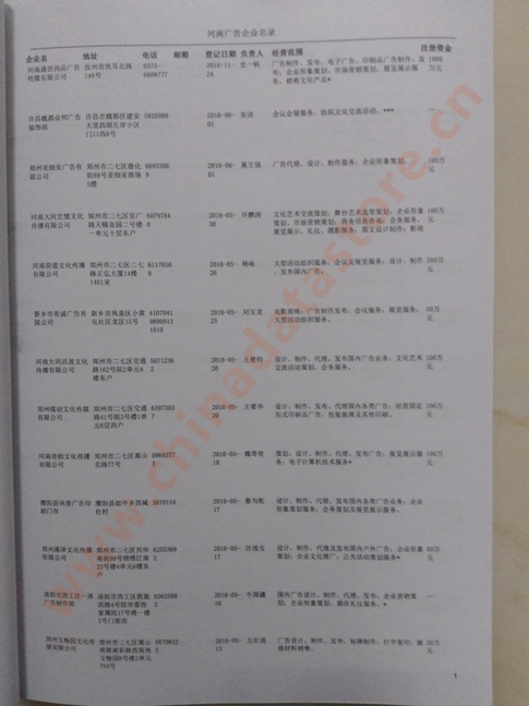 最新河南廣告生產與貿易企業(yè)黃頁數(shù)據(jù)更新日期2024年12月最新,河南廣告企業(yè)黃頁,都是具有一定規(guī)模的河南廣告行業(yè)的注冊實體企業(yè),數(shù)據(jù)準確率高,是您開展各項營銷活動的必備資料。企業(yè)名單包括:企業(yè)名稱、地址、電話(以上必有,以下選有)、傳真、郵箱、登記日期、經(jīng)營范圍、注冊資金等信息。河南廣告企業(yè)黃頁數(shù)據(jù)為Excel格式,信息可任意修改、復制、打印、導出及導入到傳真、郵件群發(fā)等軟件中,無任何限制。