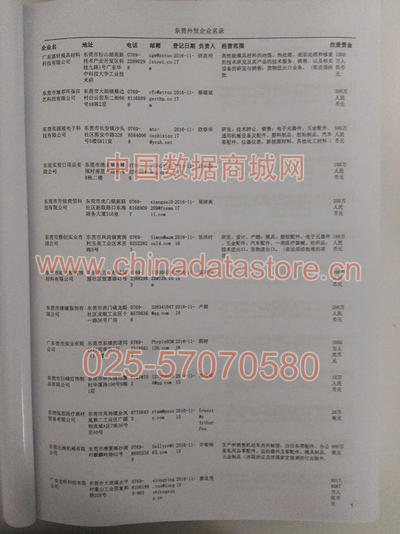 東莞外貿(mào)企業(yè)黃頁(yè)包括:外貿(mào)企業(yè)名稱(chēng)、地址、電話(huà)、傳真、郵箱、經(jīng)營(yíng)范圍、注冊(cè)資金等信息。