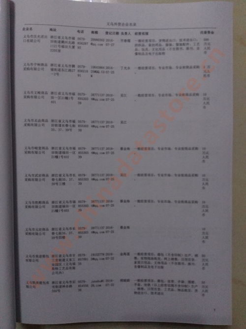 義烏外貿(mào)企業(yè)黃頁包括:外貿(mào)企業(yè)名稱、地址、電話、傳真、郵箱、經(jīng)營范圍、注冊資金等信息。