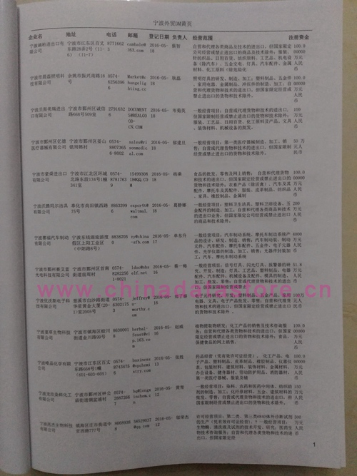 寧波外貿企業(yè)黃頁包括:外貿企業(yè)名稱、地址、電話、傳真、郵箱、經(jīng)營范圍、注冊資金等信息。