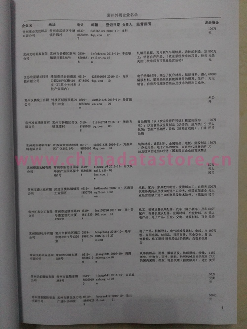 常州外貿(mào)企業(yè)黃頁包括:外貿(mào)企業(yè)名稱、地址、電話、傳真、郵箱、經(jīng)營范圍、注冊資金等信息。