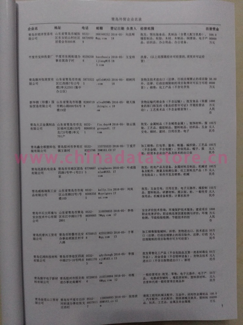 青島外貿(mào)企業(yè)黃頁包括:外貿(mào)企業(yè)名稱、地址、電話、傳真、郵箱、經(jīng)營范圍、注冊資金等信息。