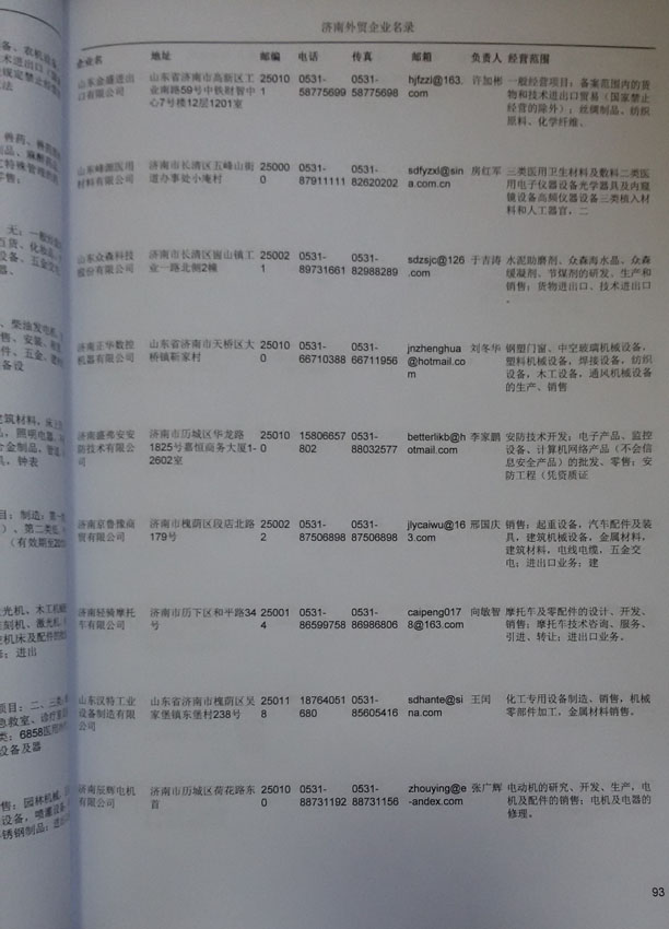 濟南外貿(mào)企業(yè)黃頁包括:外貿(mào)企業(yè)名稱、地址、電話、傳真、郵箱、經(jīng)營范圍、注冊資金等信息。