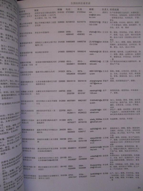 紡織外貿(mào)企業(yè)黃頁包括:外貿(mào)企業(yè)名稱、地址、電話、傳真、郵箱、經(jīng)營范圍、注冊資金等信息。