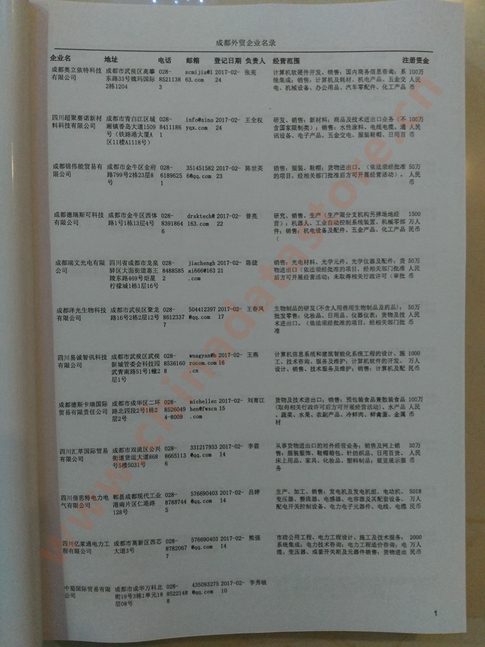 成都外貿(mào)企業(yè)黃頁包括:外貿(mào)企業(yè)名稱、地址、電話、傳真、郵箱、經(jīng)營范圍、注冊資金等信息。