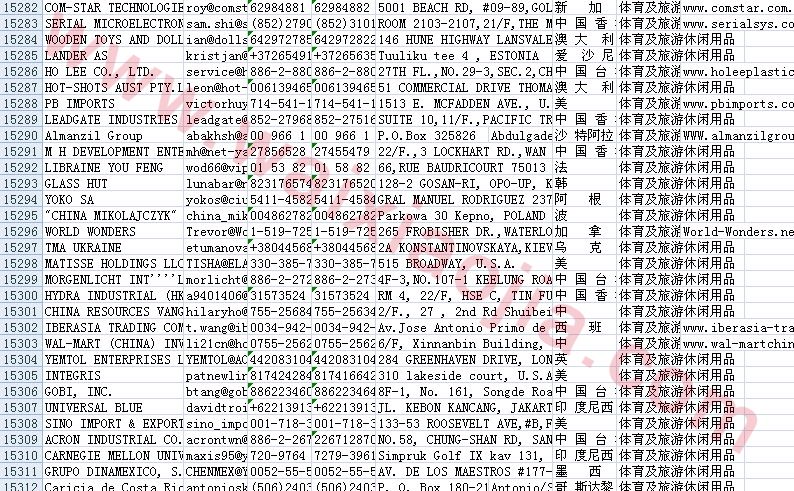 體育及旅游休閑用品采購商名單數(shù)據(jù)為Excel格式,信息可任意修改、復(fù)制、打印、導(dǎo)出及導(dǎo)入到傳真、郵件群發(fā)等軟件中,無任何限制。