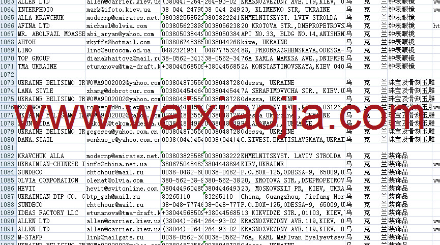 烏克蘭采購(gòu)商名單數(shù)據(jù)為Excel格式,信息可任意修改、復(fù)制、打印、導(dǎo)出及導(dǎo)入到傳真、郵件群發(fā)等軟件中,無(wú)任何限制。